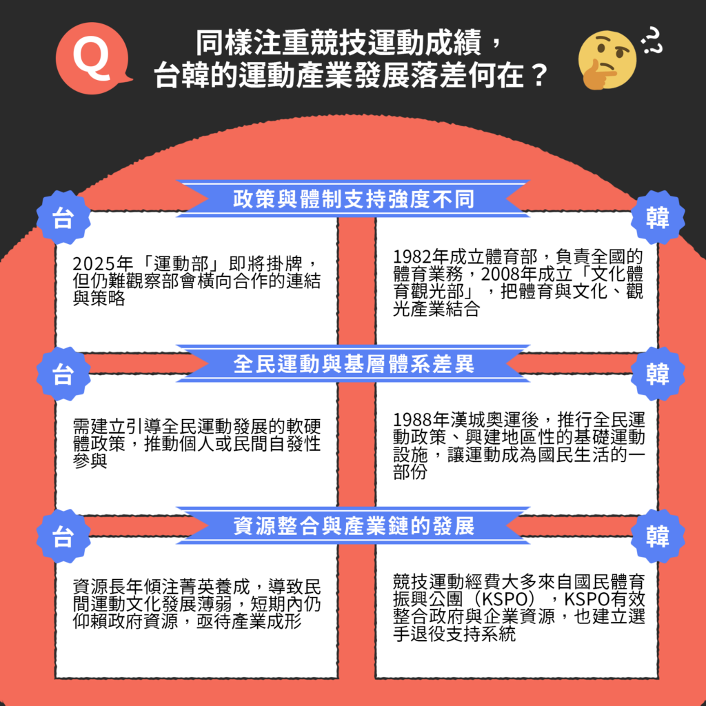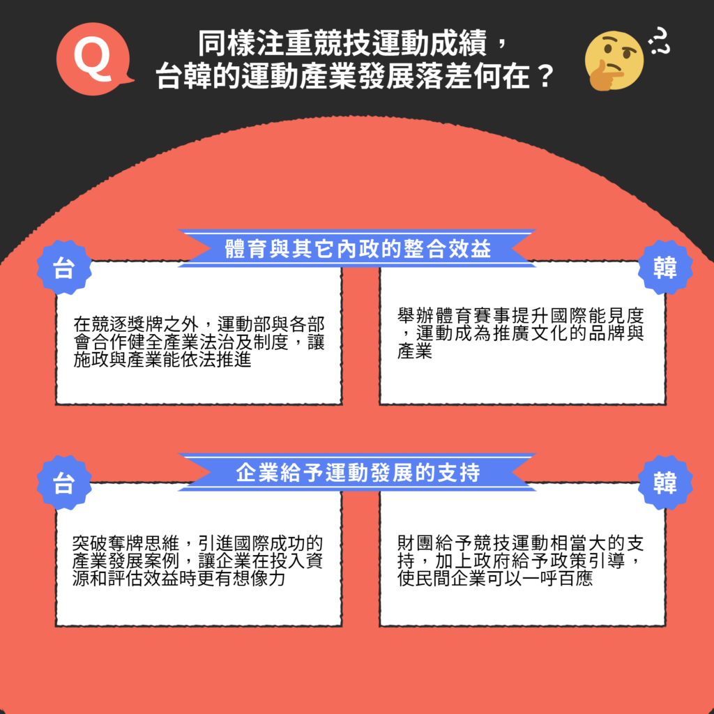 台韓在歷史背景的影響下,培育體育選手也有相似的的模式與思維,不同於美日鼓勵運動員多元發展,台韓多注重選手的競技表現與實績,皆以「奪牌」為發展目標,然而,即便兩國的體育政策同為競技導向,為何台灣的運動產業發展結果與韓國相比仍存在落差呢?