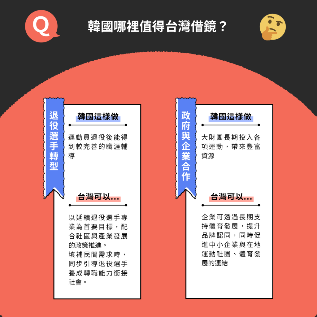 同樣都注重運動員在選手時期的成績,不過相較之下,韓國的運動員退役後能得到較完善的職涯輔導,擁有更多轉換跑道的機會。台灣應學習韓國支援退役選手的系統,透過運動部與企業進行合作、提供運動員職業培訓、就業媒合、創業資源等,讓職業運動員退役後能夠順利轉型,不至於無所適從。
