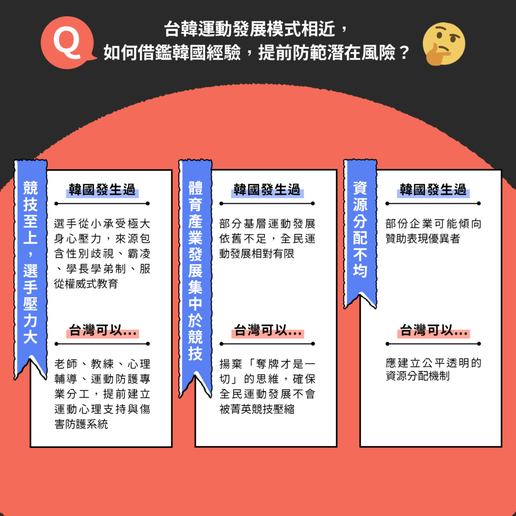 1️⃣台灣應借鏡韓國的資源整合與全民運動策略,但避免競技至上的壓力與企業化導致的不公平問題。