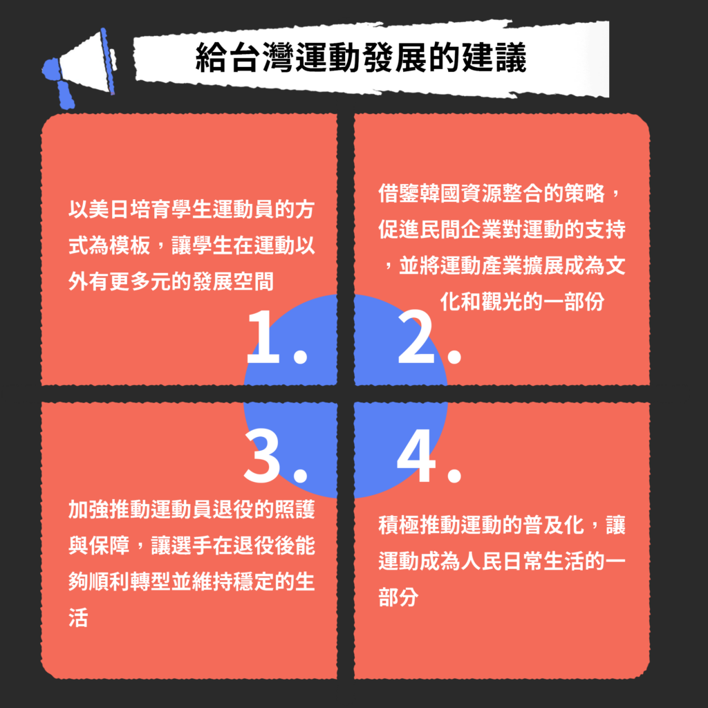台灣若要改善體育發展,應思考如何學習美日的多元教育與職涯發展模式,同時借鏡韓國的資源整合策略,讓體育不只是競技,更是一個完整的產業與文化發展體系。