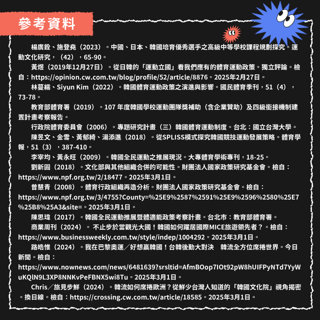 陳昱文、金雪、黃郁綺、湯添進(2018)。從SPLISS模式探究韓國競技運動發展策略。體育學報,51(3),387-410。